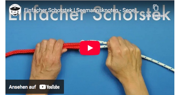 Hinweis: Der hier gezeigte Schotstek ist der sogenannte linke Schotstek, bei dem die Enden der beiden Leinen zum Schluss auf unterschiedlichen Seiten liegen. Legt man zu Beginn die Bucht anderes herum, also das kurze Ende von einem weg, entsteht der rechte Schotstek. Bei dieser Variante liegen die Enden der beiden Leinen auf der gleichen Seite. Er gilt für einige Autoren als sicherer. Steck für die Prüfung den Knoten so, wie es Dir Dein Segellehrer beibringt, denn der weiß welche Variante die örtlichen Prüfer sehen wollen!